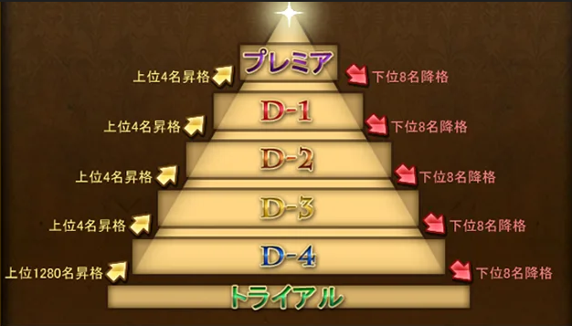 始めたばかりのプレイヤーは「トライアル」に所属し、1280位以内に入ることでD-4ランクに昇格します。