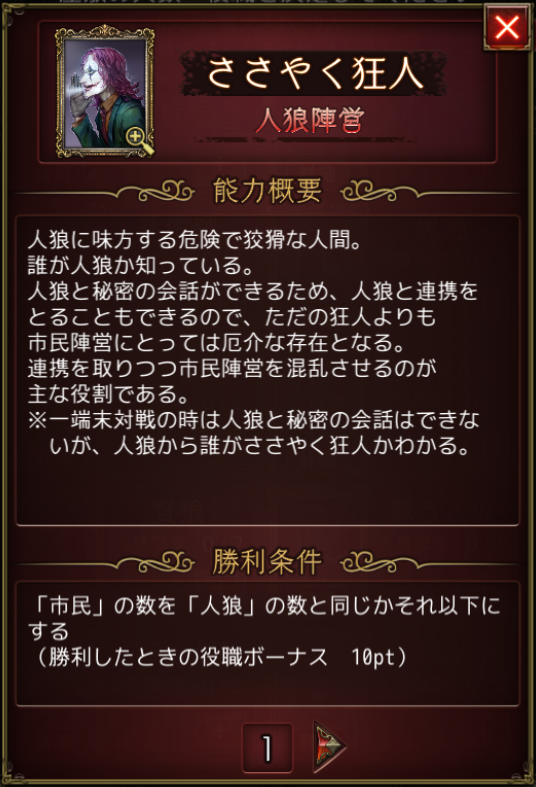 ささやく狂人は、人狼と夜会話することができる狂人。噛みの選択ができないことや勝利条件に関与しないことに注意。