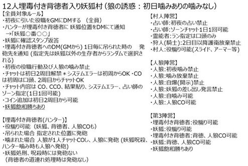 12人埋毒付き背徳者入り妖狐村とは、人狼ゲームのルール。