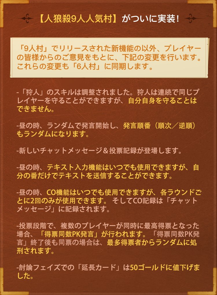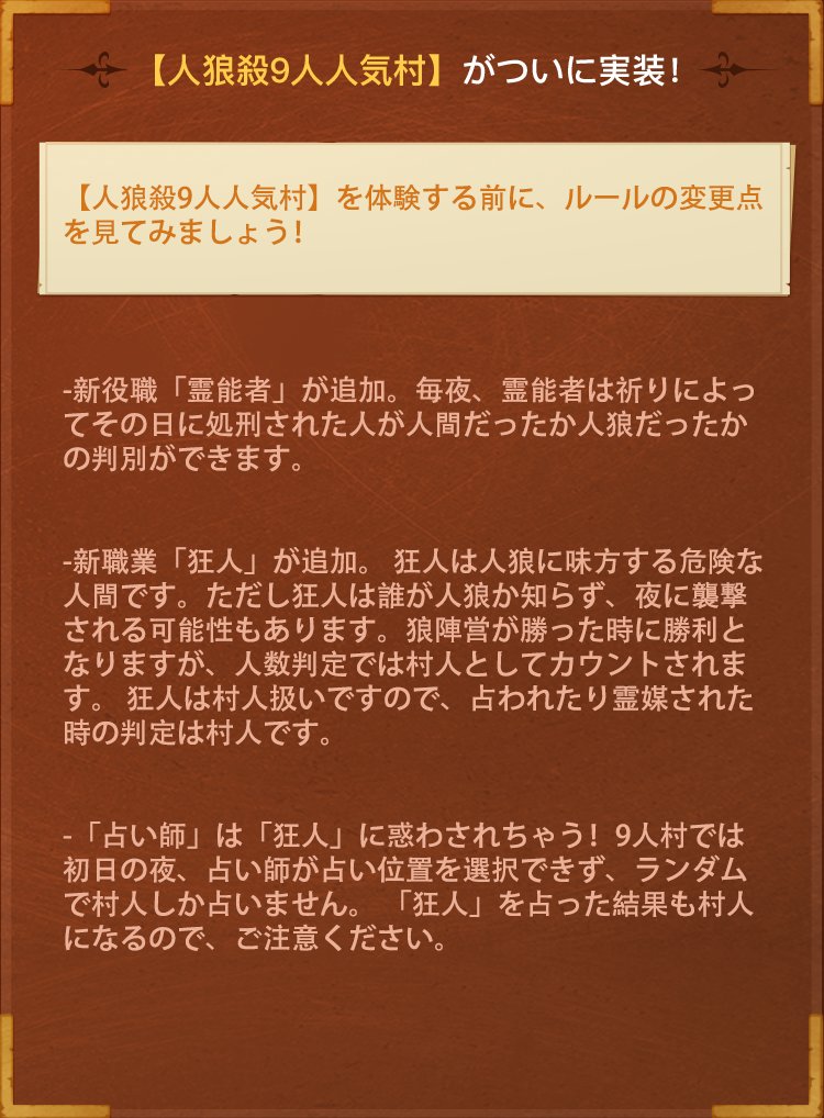 人狼殺に9人人気村が実装されました。それに伴い、いくつかの仕様が変更されました。