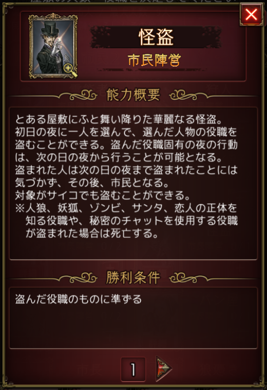 初日の夜に一人を選んで、選んだ人物の役職を盗むことができる。盗んだ役職固有の夜の行動は、次の日の夜から行うことが可能となる。