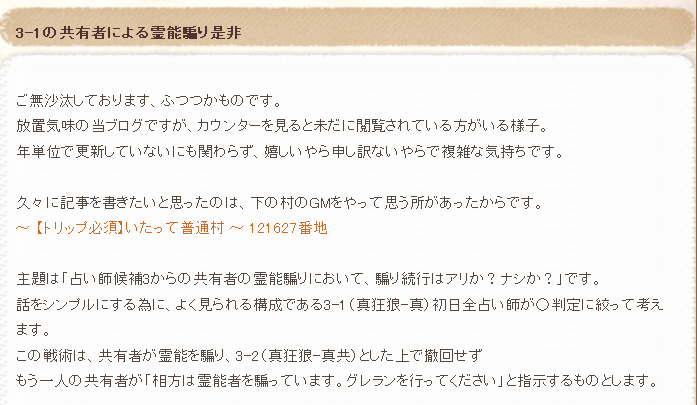 占い3CO のバックアップ(No.2) バックアップ一覧 差分 を表示 現在との差分 を表示 現在との差分 - Visual を表示 ソース を表示 占い3CO へ行く。 1 (2022-10-11 (火) 17:30:58) 2 (2024-07-12 (金) 14:05:28) 占い3CO(うらないさんしーおー)とは、占い師自称者が3人出ていること。 2012年ごろには、占い師候補3といった表現も使われている。 br (参考「ふつつかな日常」2012.12.10) ref