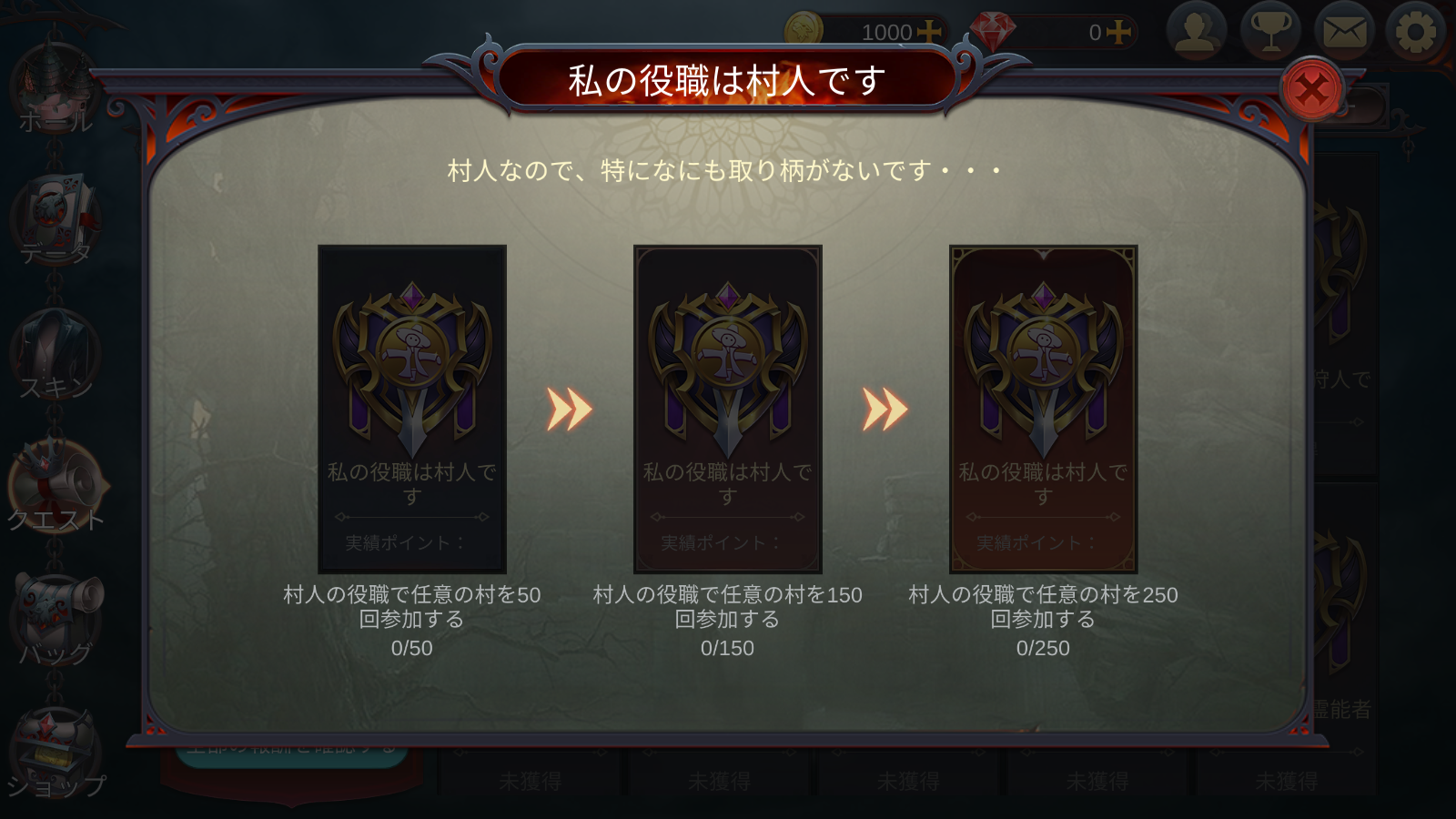 達成条件:指定された役職で〇回村に参加すると達成。