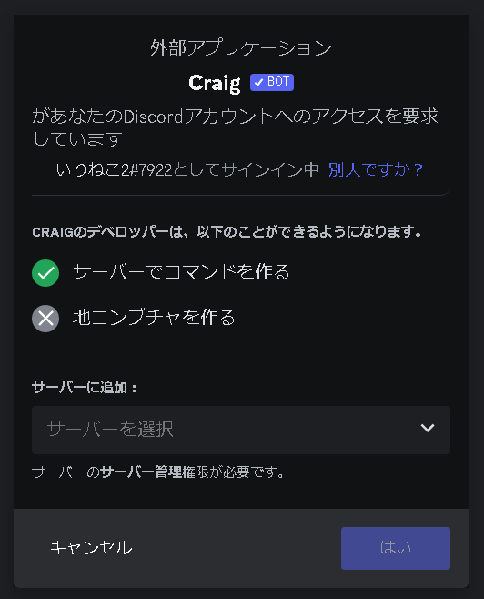 ログイン済みの場合は、画像のように「Craigを呼びたいのはこのアカウントで合っているか」及び「どのサーバーに呼ぶか」の確認画面が出ます。