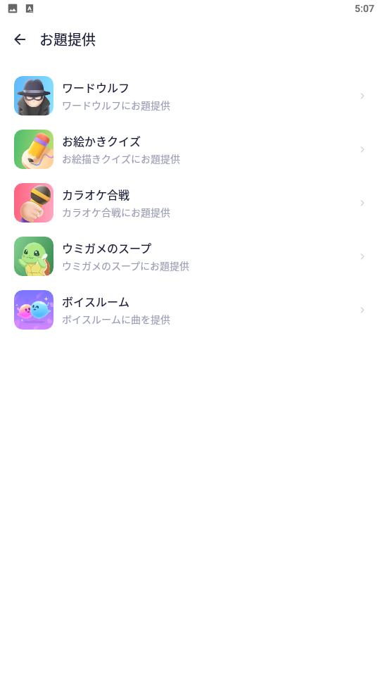 WePlay/お題提供 のバックアップ(No.2) バックアップ一覧 差分 を表示 現在との差分 を表示 現在との差分 - Visual を表示 ソース を表示 WePlay/お題提供 へ行く。 1 (2023-09-11 (月) 06:32:23) 2 (2023-09-13 (水) 18:27:45) 本ページは、WePlayのお題提供について記述しています。 br ref ワードウルフお絵描きクイズにお題提供お絵描きクイズお絵描きクイズにお題提供カラオケ合戦カラオケ合戦にお題提供ウミガメのスープウミガメのスープにお題提供ボイスルームボイスルームに曲を提供