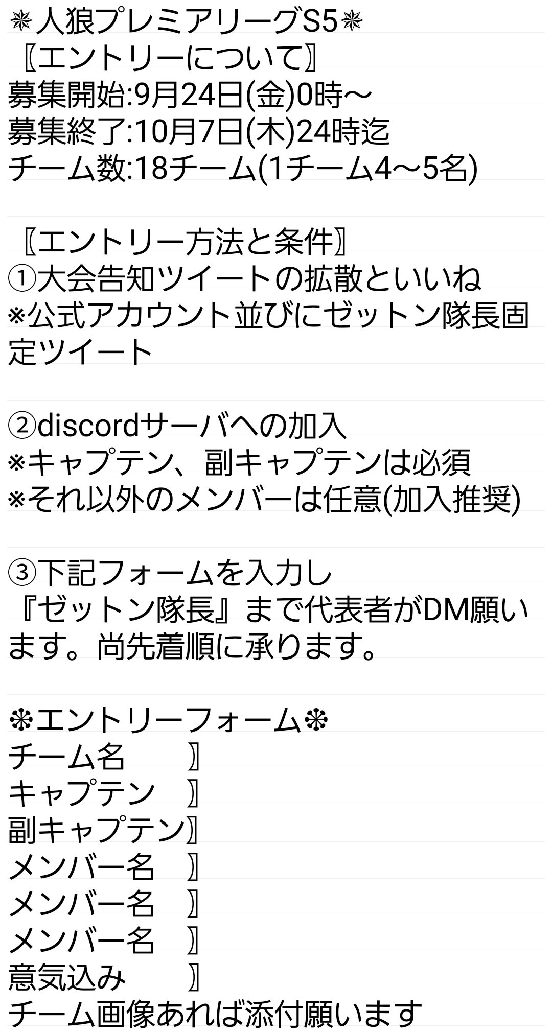 | ⑫ | ピザとパスタ | 腐ったみかん様 | ゆうきデフォ狂 | 白桃いちご | こひなな | コスモポリタン | 最強のメンバー集めました、優勝できんかったら全員引退します。多分余裕すぎて困るかも。笑 | |