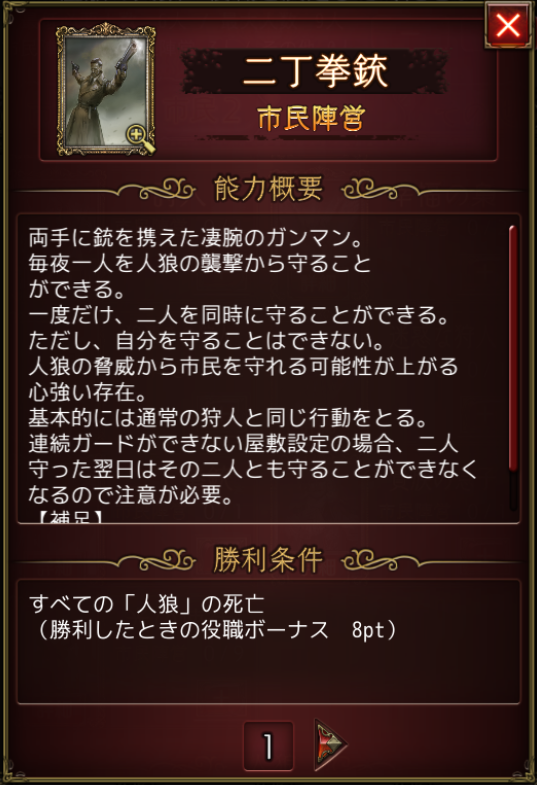また、人狼ジャッジメントの護衛能力を持つ役職は、人狼ジャッジメント/狩人を参照ください。