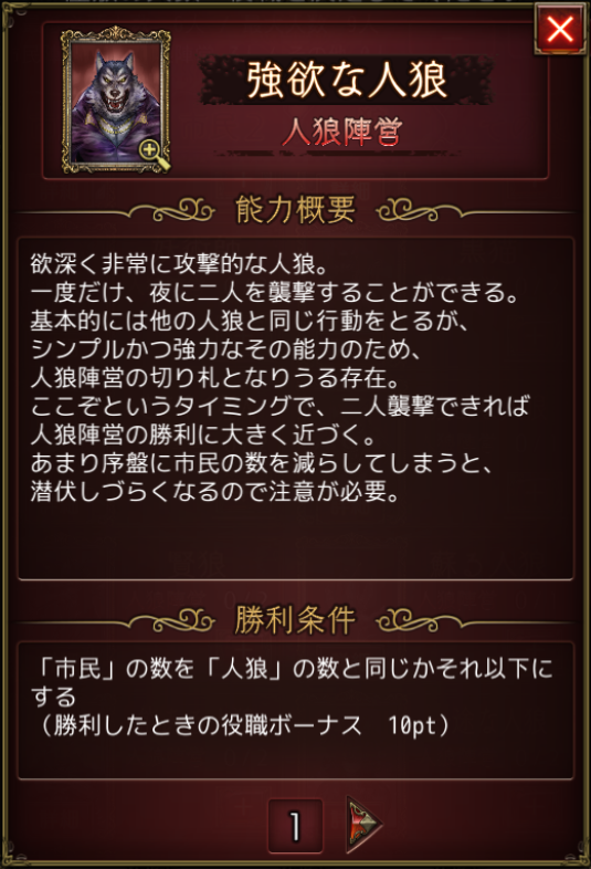 強欲な人狼はゲーム中一度だけ二人を同時に襲うことができます。市民が少なくなった時などに使うことで勝利を大きく引き寄せることができます。