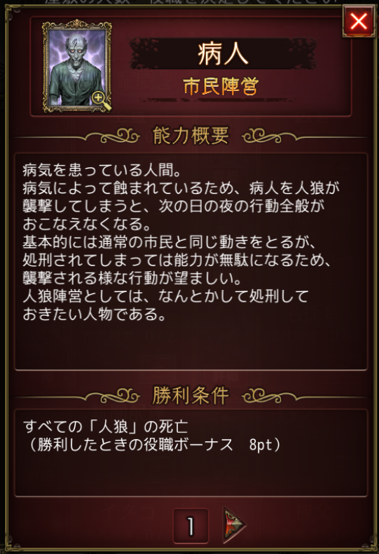 病気によって蝕まれているため、病人を人狼が襲撃してしまうと、次の日の夜の行動全般がおこなえなくなる。