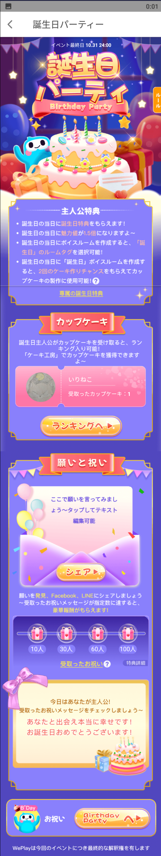 ・誕生日の当日に「誕生日」ボイスルームを作成すると、2回のケーキ作りチャンスをもらえてカップケーキの制作に使用可能!