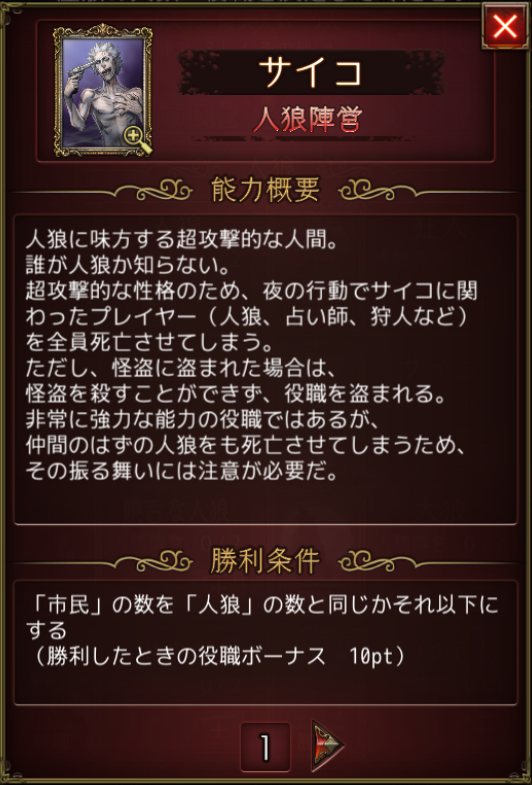 | 説明文 | 人狼に味方する超攻撃的な人間。誰が人狼か知らない。 超攻撃的な性格のため、夜の行動でサイコに関わったプレイヤー(人狼、占い師、狩人など)を全員死亡させてしまう。 ただし、怪盗に盗まれた場合は、怪盗を殺すことができず、役職を盗まれる。 非常に強力な能力の役職ではあるが、仲間のはずの人狼をも死亡させてしまうため、その振る舞いには注意が必要だ。 |