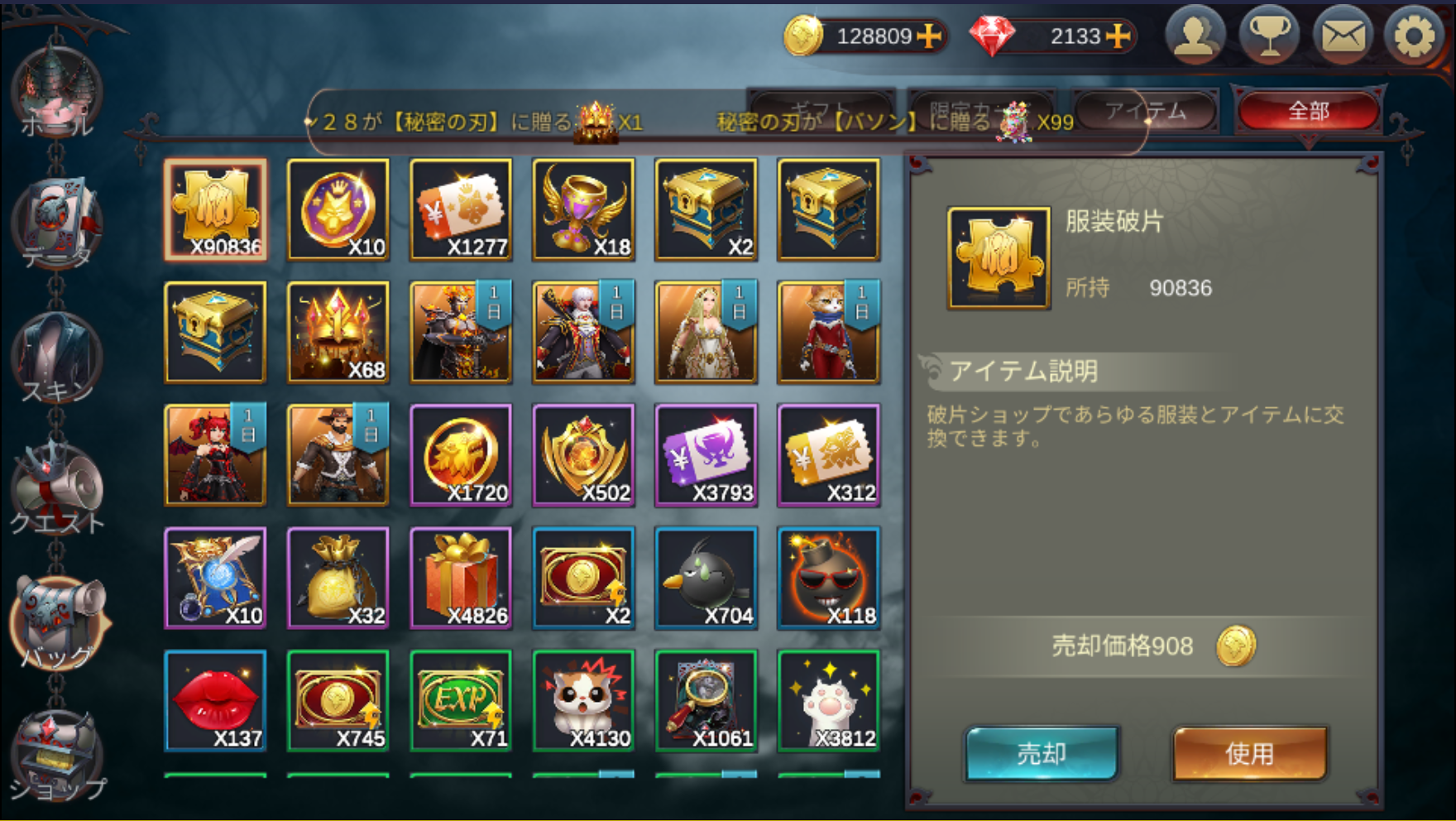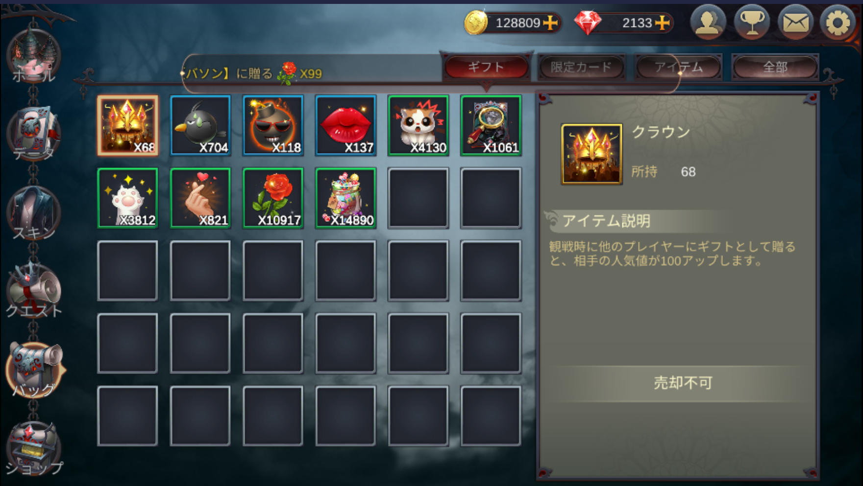 | ギフト | 持っているアイテムの中で、ギフトのみを表示します。 |