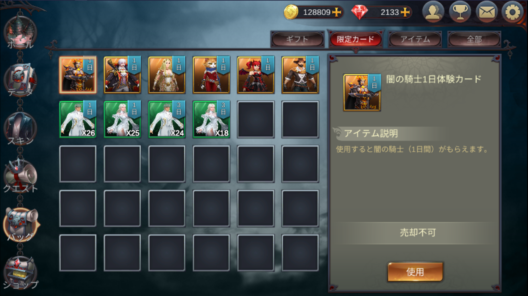 | 限定カード | 持っているアイテムの中で、期間限定衣装使用券のみを表示します。 |