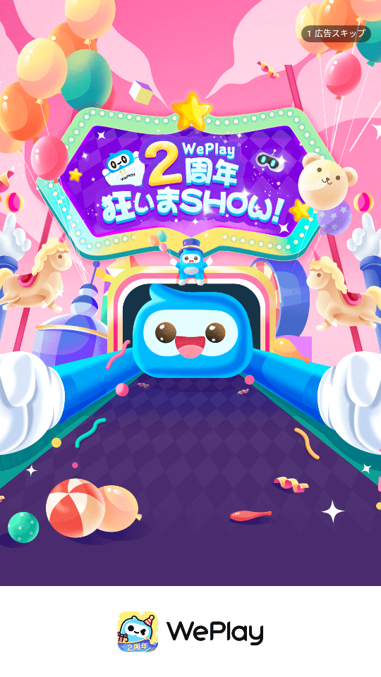 WePlay起動時、2周年イベントの広告が表示されています。