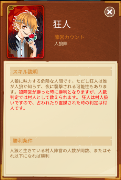 自分が狂人になった場合は人狼のために考えて行動する必要があります。