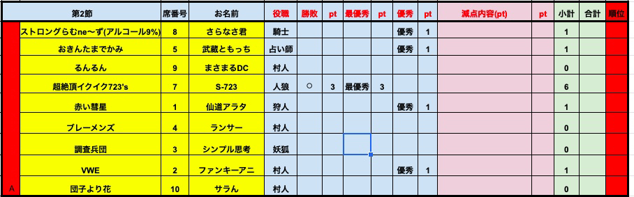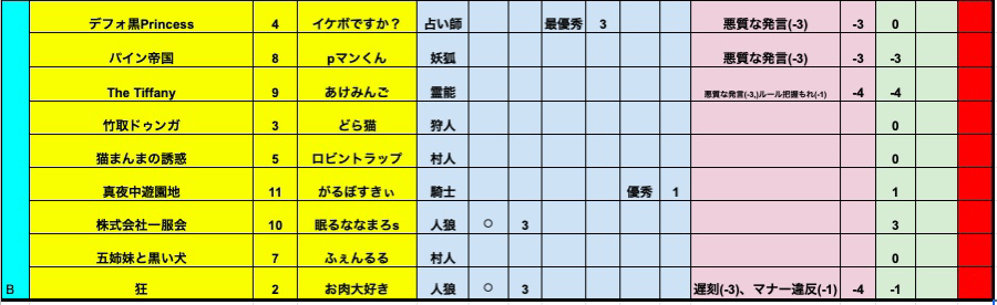 減点理由:霊能者CO。 ゲーム性崩壊のきっかけ作った。(-3点)それに加えレギュに存在しない役職発言「4番は狂人ね」(-1点)