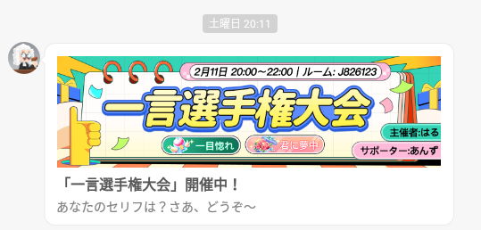 本日、20:00より一言選手権大会が開催されます。
