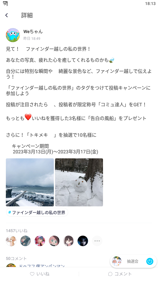 「ファインダー越しの私の世界」タグをつけて投稿すると、「コミュ達人」の称号が手に入るチャンスです。