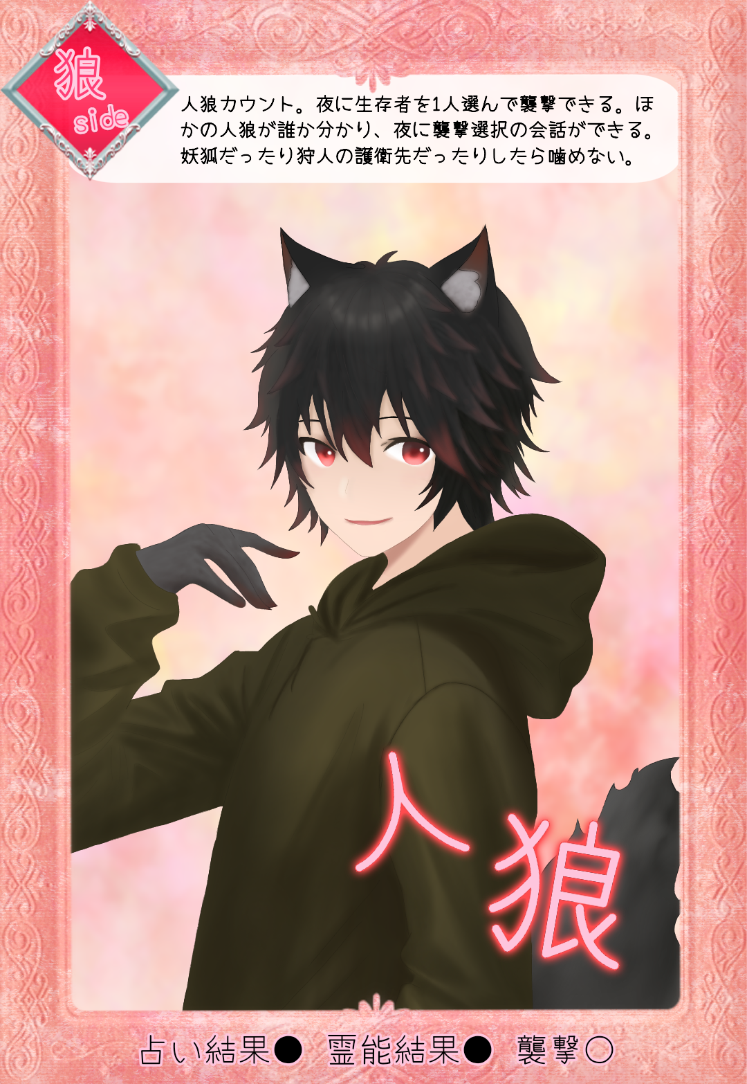 ref | 人狼 | 人狼さん (人狼1さん) 1981/8/15生まれ 男性「さぁ、この村を喰い尽くそうではないか?!」 | |