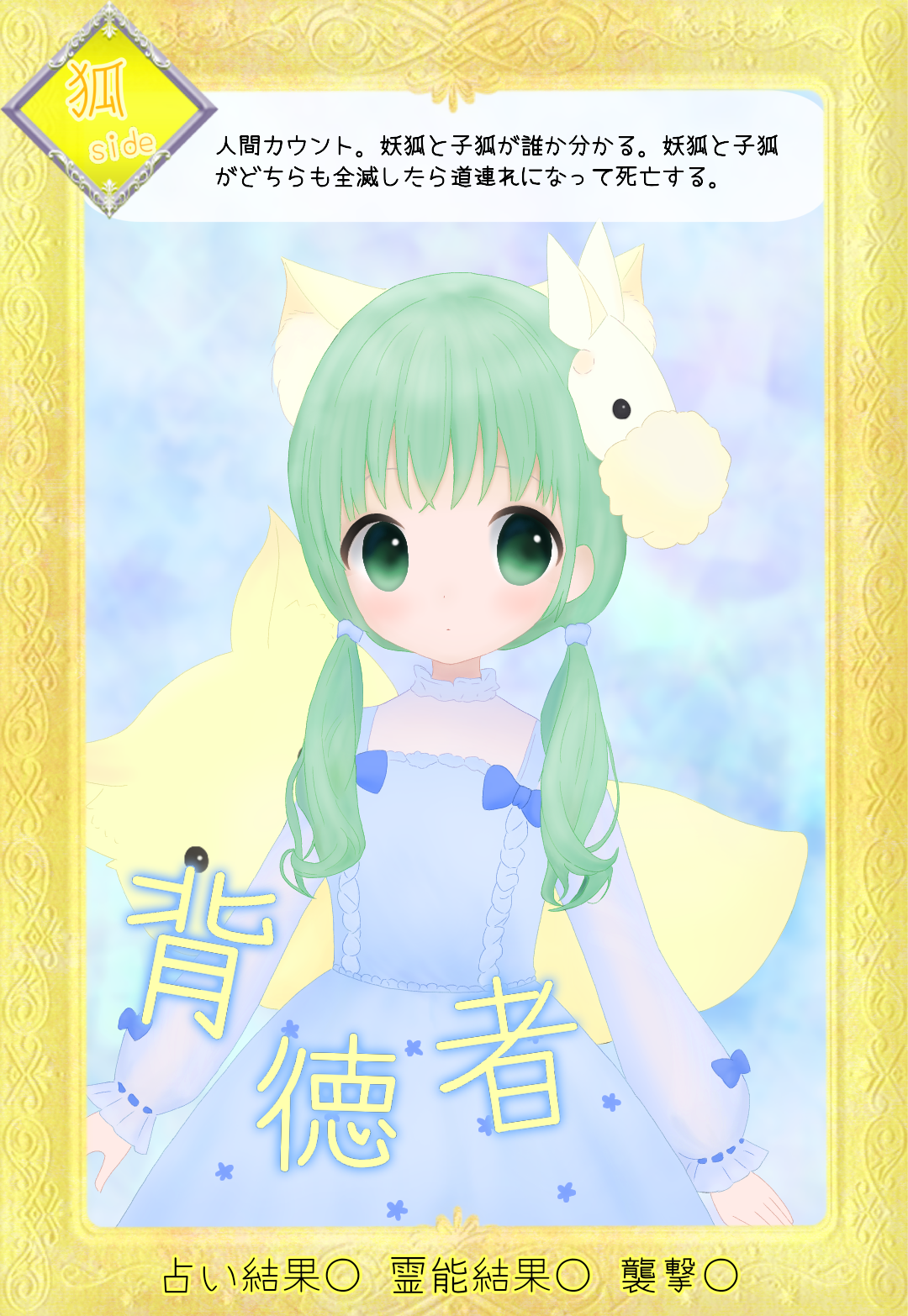 ref | 妖狐 | 妖狐さん (妖狐1さん) 1890/9/10生まれ 女性「何で村人たちから狙われるの?人狼と違って誰も殺さないのに…誰も傷つけないのに…!」 | |