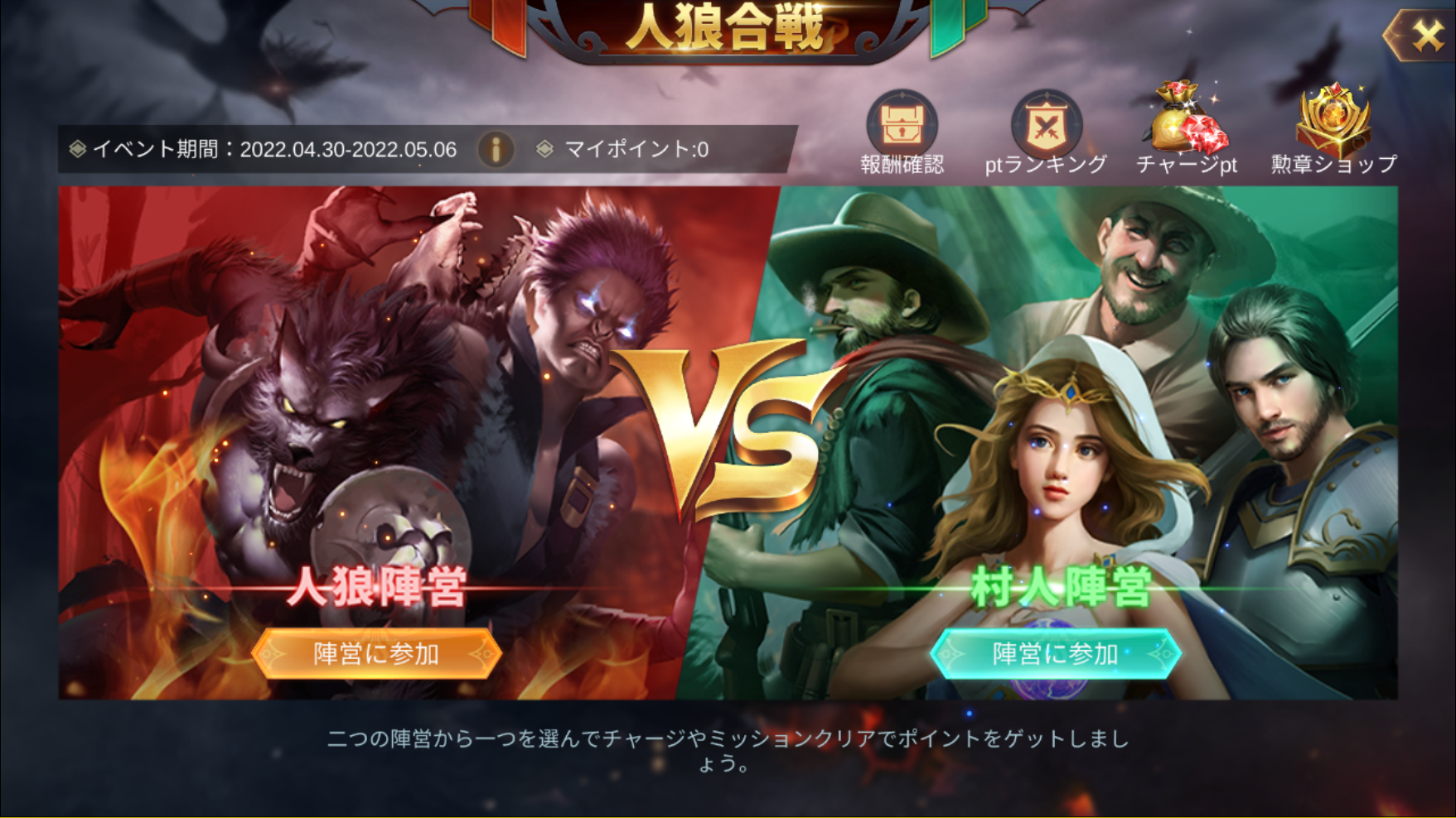 プレイヤーは、イベント参加時に「村人陣営」か「人狼陣営」を選択する。所属した陣営の専用クエストをクリアしていく。所属した陣営はイベント終了まで変更することができない。